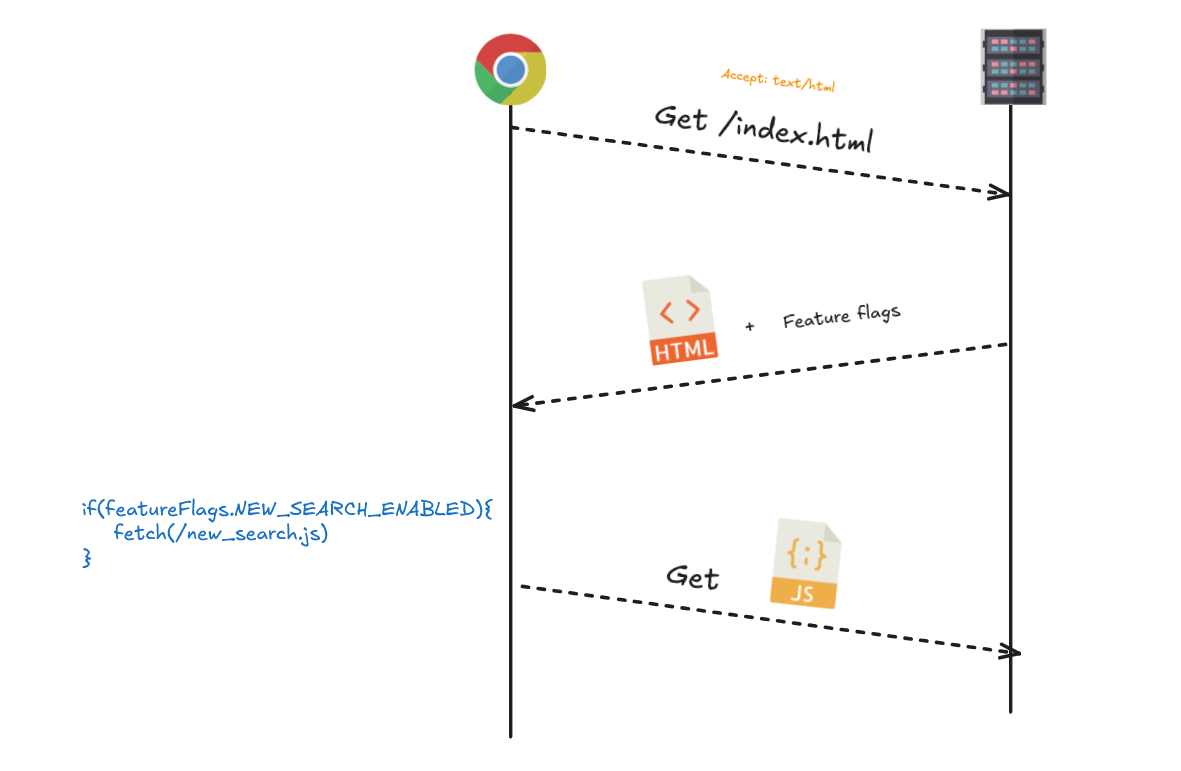 Feature flags are usually injected in the initial HTML, then the application on the client will read the feature flags and load the necessary JavaScript and display one UI or another.