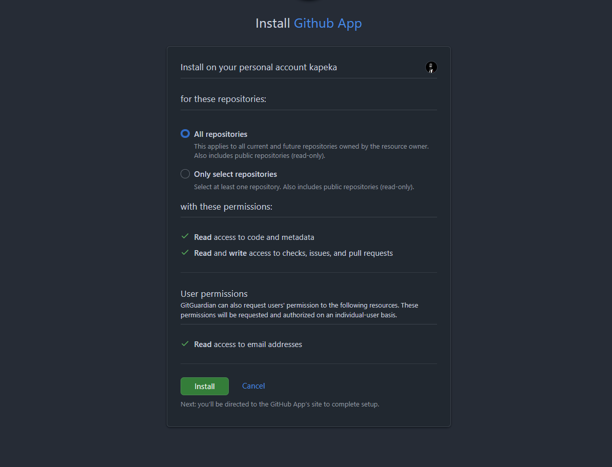 A GitHub App acts on your GitHub resources with the permissions you grant it when installing it, which by default is full access (read & write) to all repositories (root💀).