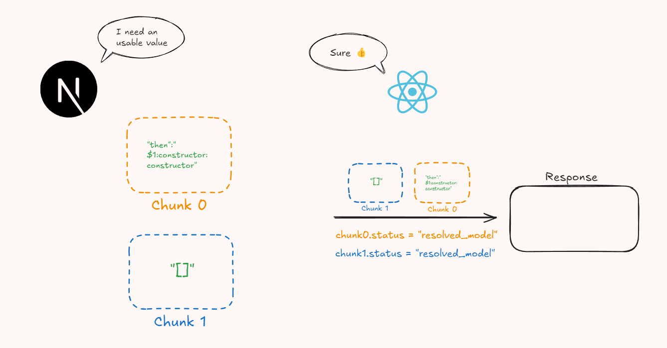 Because of this, chunks are now called ReactPromise. This is the data structure (modified in the patch) that ReactFlightClient was already using, which is the file where Server → Client deserialization happens.