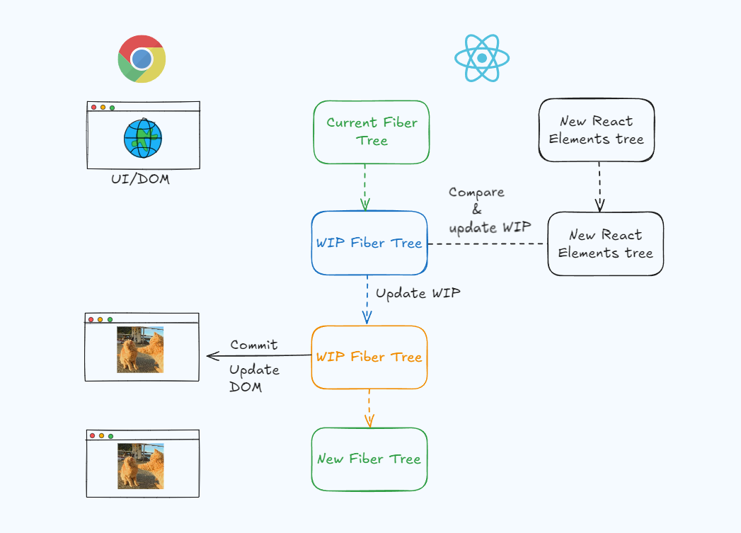 React, on the other hand, optimizes these calculations using its Virtual DOM. In each render, React has two Fiber trees: